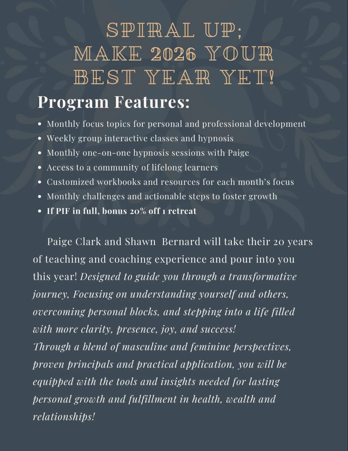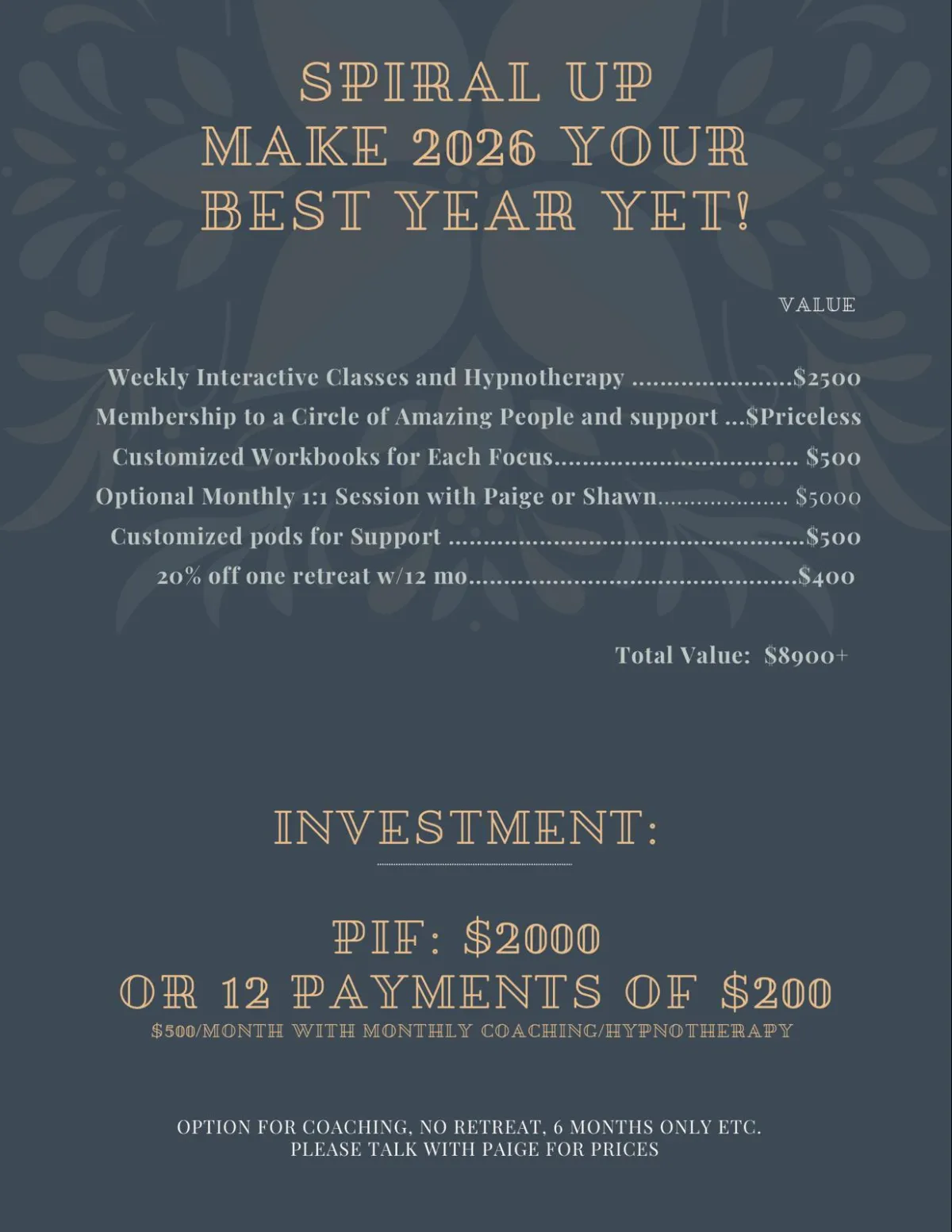 Spiral Up 2026 is a year-long journey designed to align your subconscious and conscious mind, release old patterns, and build powerful new ones — so momentum becomes natural, clarity becomes embodied, and growth feels sustainable.